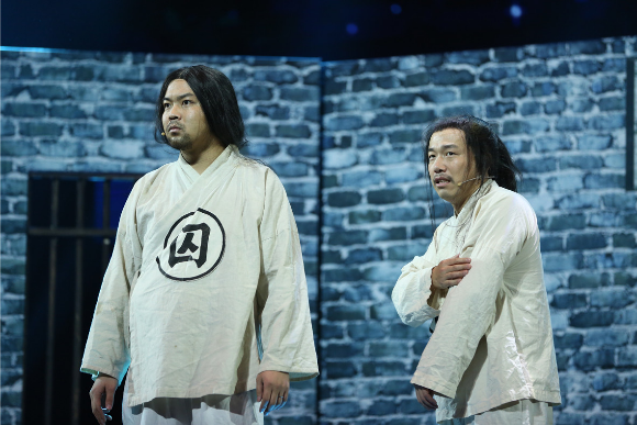 潘斌龙和崔志佳带着冠军的光环来到首轮淘汰赛,此次,两人化身蠢萌囚犯兄弟,在救大哥的路上也是一个“囧”字当头,爆笑展示了一百种失败的“越狱”方法。大潘、佳佳浓重的东北口音,再加上逗趣傻傻的表情,引发观众阵阵笑声。