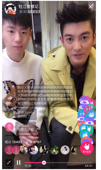 1月25日晚,“人气奶爸”杜江首次在美拍上进行直播,当天他出席新电影《高跟鞋先生》的点映会,并在点映会休息间隙与网友在线互动,短时间内吸引了几万网友围观,并获得两百多万点赞数。