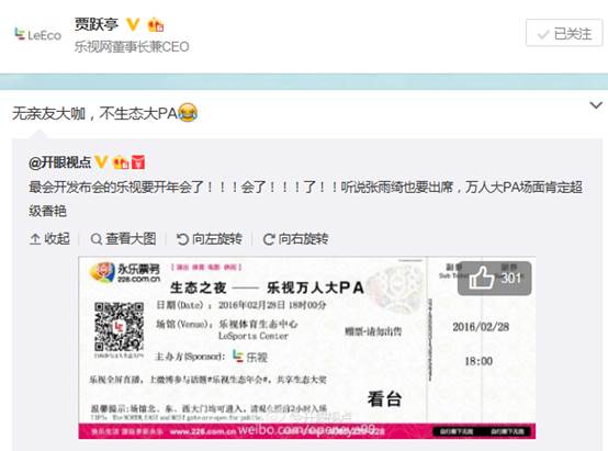 昨日(2月16日)有网友在微博上透露“最会开发布会的乐视要开年会了!!!会了!!!了!!听说张雨绮也要出席,万人大PA场面肯定超级香艳。”并晒出了一张乐视年会的入场券,微博爆料的张雨绮将出席乐视大PA的消息也一下子戳中了网友的G点。随后乐视创始人贾跃亭转发该微博时称:“无亲友大咖、不生态大PA”,透露乐视将在2月28日在乐视体育生态中心召开万人大PA。张雨绮在今年最热的贺岁大片《美人鱼》中饰演美艳绝伦的大反派若兰,令人印象深刻,霸道总裁气场全开,魔鬼身材令人喷血,惊艳了无数网友,人气也随之大涨。目前该片正在影院热映,连续打破多项纪录,短短9天票房已突破21亿,超越《捉妖记》登顶中国内地票房冠军的位置指日可待,张雨绮也有望凭借此片赢得“票房女王”的桂冠。
