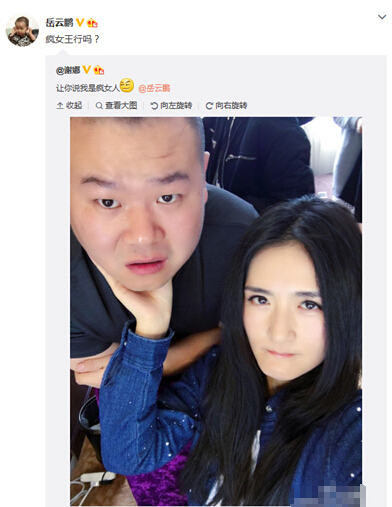 今日,谢娜在微博上传与岳云鹏的搞怪合影,留言称:“让你说我是疯女人。”照片中,她用手掐住岳云鹏的脖子,还做出凶狠的表情。而岳云鹏一脸惊恐的表情,样子十分搞笑。随后,岳云鹏转发微博并打趣称:“疯女王行吗?”