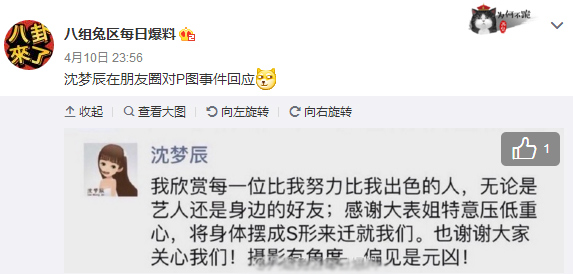 疑似沈梦辰在朋友圈中写道:“我欣赏每一位比我努力比我出色的人,无论是艺人还是身边的好友;感谢大表姐特意压低重心,将身体摆成S形来迁就我们。也谢谢大家关心我们!摄影有角度,偏见是元凶!”