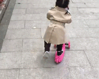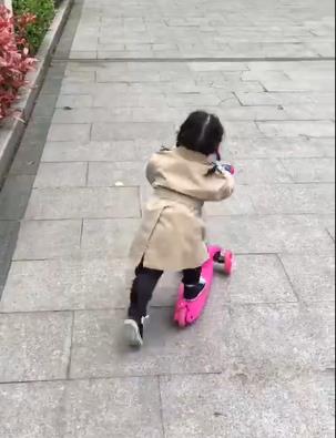 视频中,小花妹妹穿着小风衣,踩在一辆粉红色的滑板车上,动作熟练。踩了几步后,她还把左腿高高抬起,金鸡独立的姿势难度系数很高啊!
