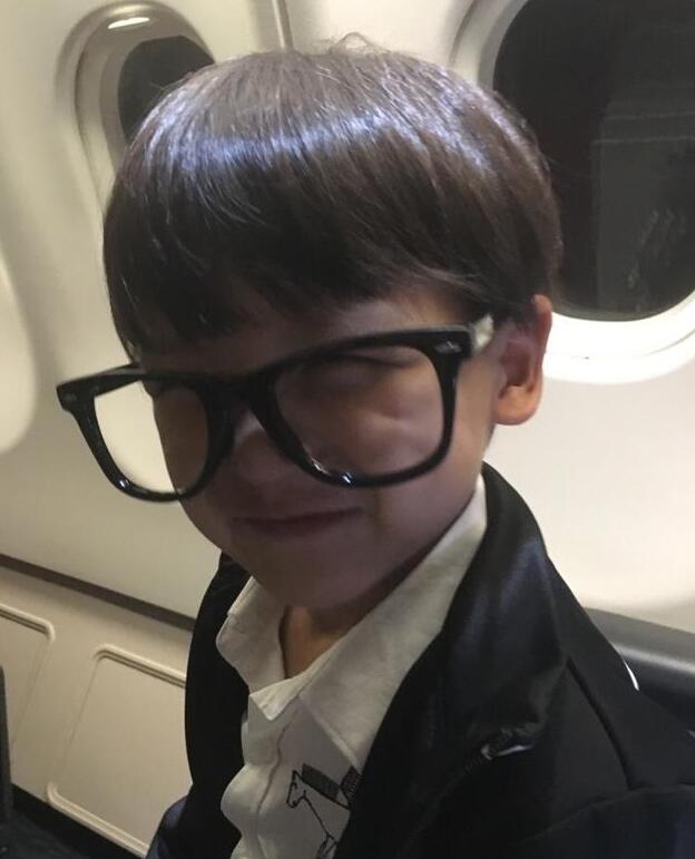 5月16日晚,田亮在微博晒出儿子坐飞机的萌照,并写道:“小小年纪,抢眼镜的功力已不输姐姐,哼!本爸爸的高冷斯文帅气飞扬是那么好山寨的嘛!”照片中,小家伙留着可爱的西瓜头,戴着与脸不相配的超大黑框眼镜,眯着眼睛笑得十分夸张,非常可爱呆萌。