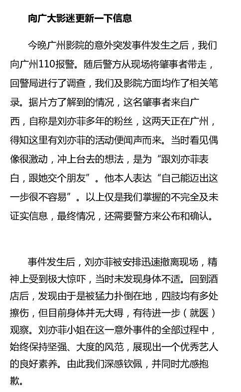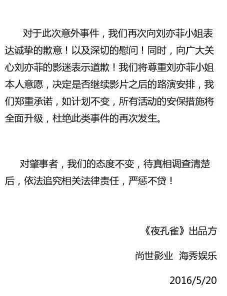 11时,《夜孔雀》出品方发声明对此事进行回应,表示刘亦菲在此次事件中身体并未受伤。片方指事件是有粉丝因突然激动而翻越隔离铁马冲上舞台,令刘亦菲受到惊吓。保安已经制止住了粉丝的过激行为,并已经报警。目前,对肇事者人员的调查正在进行中。据悉,刘亦菲之后的三场路演都将取消。