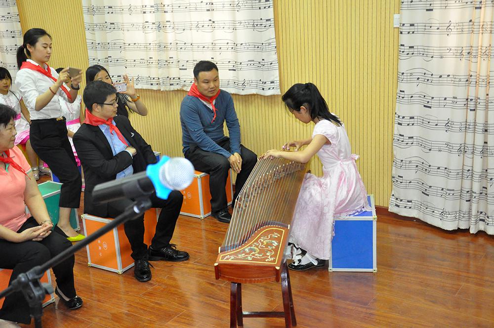 在众筹而成的音乐教室里,蓝天学校的合唱团成员们为现场嘉宾带来了《童心是小鸟》《蓝天梦》的合唱表演。器乐队的学生则用新添置的古筝弹奏了一曲《战台风》以表达对音乐教室建成的感谢。