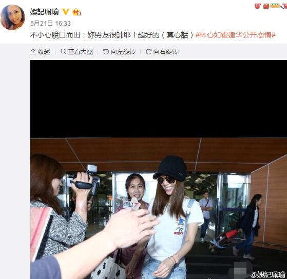 有娱乐记者在微博分享采访林心如的经过,笑说:“不小心脱口而出:你男友很帅耶!超好的(真心话)”,结果换来女神露齿灿笑,网友说:“一看就知道是恋爱中的女人”、“老林笑开花了,为有这么帅这么好的男朋友自豪吧”“看老林一脸幸福的样子,祝福”。