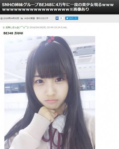 在一水之隔的日本,媒体总喜欢评选出一些所谓“千年一遇”的美女。除了本国的美女外,日媒也很关注中国美女,此前,上海少女团体SNH48的鞠婧祎就被他们评为“四千年一遇的美少女”。而现在,SNH48北京姐妹团BEJ48的成员苏杉杉也被描述成“四万年一遇的美女”了。图为日媒报道。