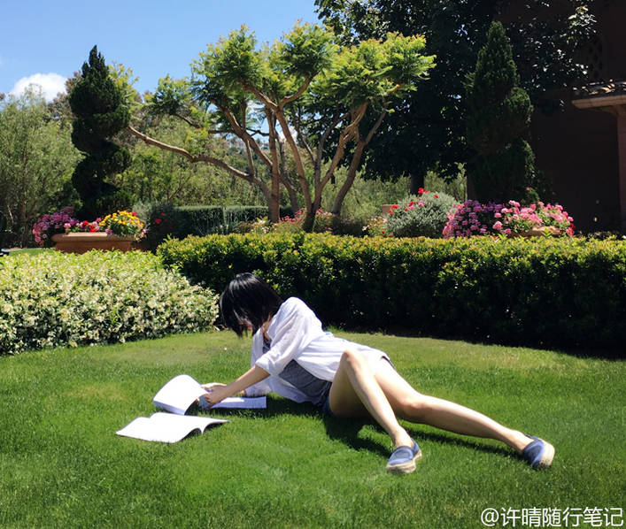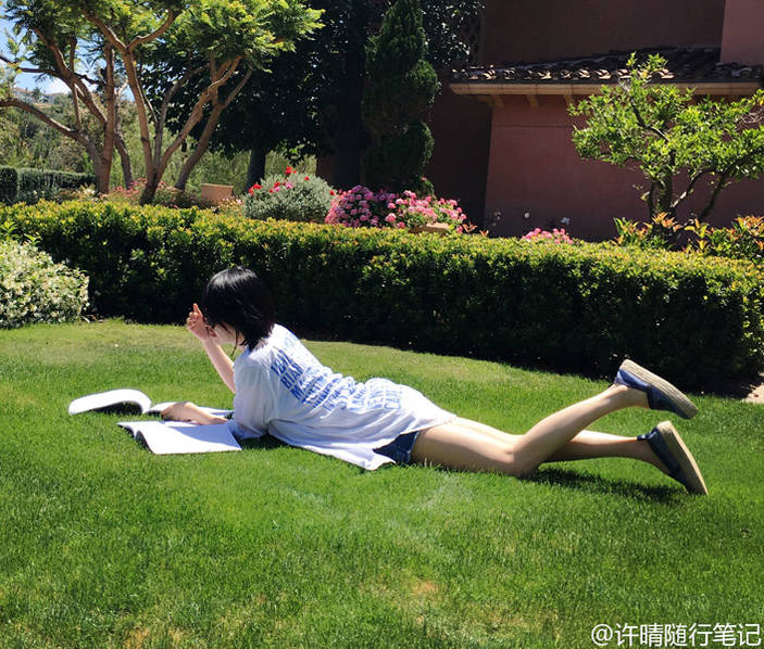 许晴躺在草地上看书。