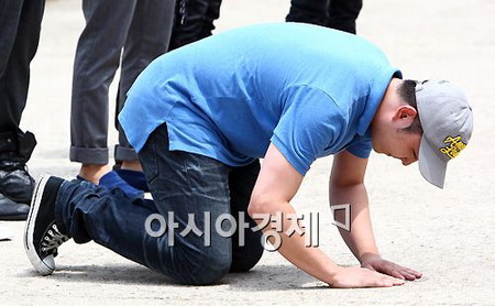 卷入殴斗案而被雪藏的组合Super Junior(SJ)成员强仁2010年7月5日入伍,400多位来自韩国等地的Fans送行,SJ的队友亦现身支持。期间强仁跪地多谢Fans,更承诺会好好当兵,说到感动处更忍不住流下男儿泪。(资料图)