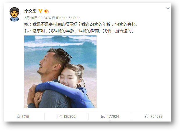 “周冬雨 :我是不是身材真的很不好?我有24岁的年龄,14岁的身材。 余文乐:沒事啊,我34岁的年龄,14岁的智商。我们,挺合适的。”大叔实力宠溺萝莉,这猝不及防的浪漫告白,虐遍天下单身汪!汪汪汪~