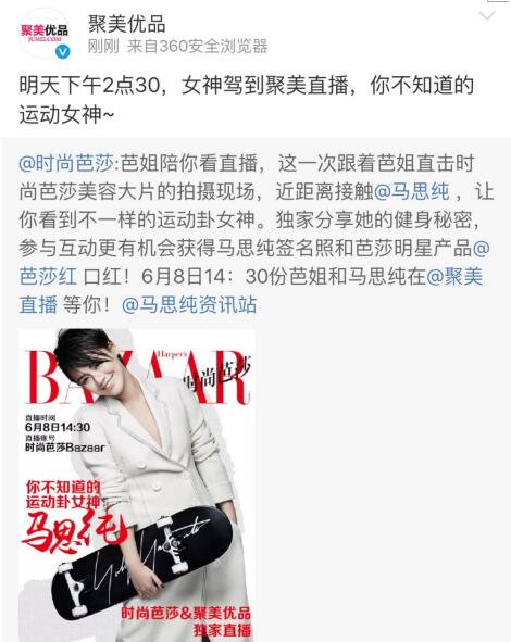 现身各大颁奖礼,出席各大时装周,马思纯近年来也成为新晋的红毯女神。聚美直播将直击马思纯时装大片拍摄现场,让小马哥与大家分享自己的时尚心得、护肤秘籍,还有粉丝们最关心的减肥、健身、运动实用干货。据悉,届时观看直播的粉丝都有机会获得小马哥送出的美妆大礼和秒杀红包。