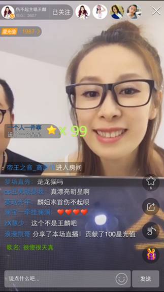 当晚8点半刚过,无数粉丝已经在繁星直播平台上不断刷新,等候王麟的开播。还没到9点,王麟便亮相在繁星直播间,跟大家打招呼:“大家晚上好,我是王麟”。但话音还没落,粉丝们纷纷留言:“你真的是王麟吗?”“现在是模仿秀时间吗?”“繁星真厉害,竟然能请来这么大咖的明星!”看到这些留言,王麟笑了,她说,今天虽然戴了眼镜,跟往常形象有点不同,但她确实就是唱《伤不起》《QQ爱》的歌手王麟。随后,新旧粉丝们在留言区纷纷刷屏,大呼王麟知性美。移动歌友会开播仅仅10分钟,星光值便破5万,人气可谓爆棚。