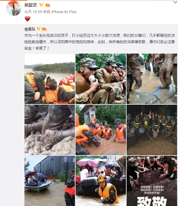 连日来,我国南方部分地区普降大暴雨,造成多处洪涝灾害,尤其以湖北等地最为严重,奋战在抗洪救灾第一线的官兵们也成为社会各界关注的重点,身为武汉儿媳的张歆艺与丈夫袁弘也在微博表达了对抗洪救灾官兵的致敬。袁弘在微博中写到:“作为一个生长在武汉的孩子,打小经历国大大小小数次洪涝,我们的父辈们,几乎都曾在抗洪抢险前线值守,所以深知其中的危险合艰辛,此刻,向所有的抗洪英雄致敬,请你们务必注意安全!辛苦了!”随后张歆艺转发微博,用一颗心表达了对前线官兵的敬意。