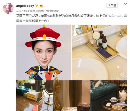 照片中,欧式奢华风的豪宅从洗手间、梳妆台、客厅的每一个角落都放着一台美图手机,脑洞大开的粉丝已经脑补了女神自拍的一整天,从清晨醒来到化妆、休息、吃饭每个瞬间都要来一张自拍记录,果然是美图手机的代言人,也有网友表示“有颜任性”、“果然长得好看的人都爱自拍”。