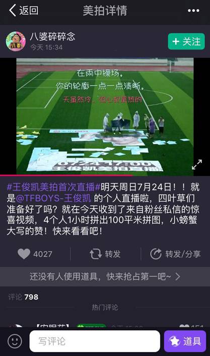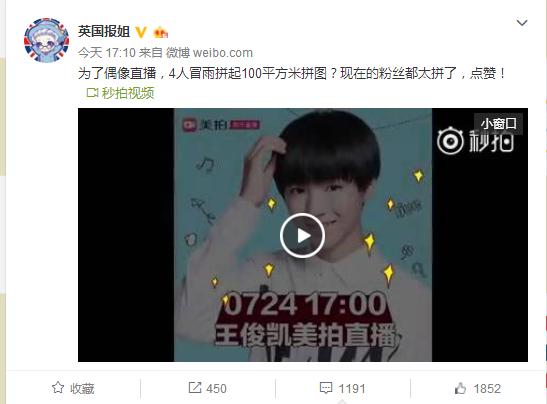 王俊凯作为TFBOYS的队长及团队核心,其粉丝“小螃蟹”们对偶像一直爱的“疯狂”,这一次为了支持偶像的个人美拍直播首秀,粉丝们更是“豁出去了”,冒大雨拼长图,并且拍下全程,以此来号召更多“凯妹”加入安利行列。