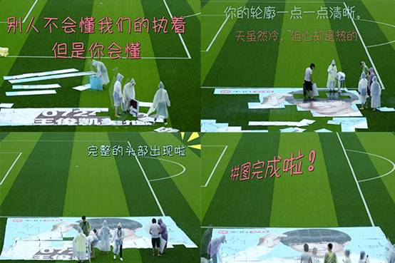 最近又有粉丝为偶像应援搞了个“大新闻”。日前,TFBOYS队长王俊凯的粉丝在微博发出一段视频,视频中四个女粉丝穿着雨衣拼出了一幅王俊凯肖像十米长图,为偶像7月24日的美拍直播应援。粉丝在微博里表示,“小凯要在美拍直播了,我们希望更多人来关注他的个人首秀,所以拼了这个100平米的大图,大家都冒着大雨,有的人手机还泡水了。”此视频一经发出就引来王俊凯后援会、美拍官方账号转发,转发量半小时内破千,随后峰峻文化、英国报姐等也加入转发大军,也有网友评论“这年头这么‘执着’的粉丝已经不多见了。”