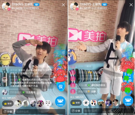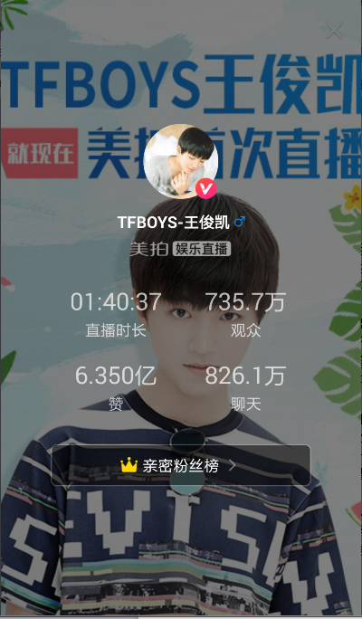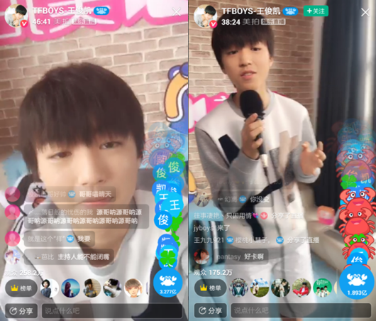 据悉,王俊凯此次个人直播再次刷新了多项美拍直播记录,不仅“狂吸”了735万总在线人数,获赞6.35亿次,其评论数更是突破了826万余条,超过此前TFboys三人组合在美拍直播时的全部数据,刷新全网互动评论新记录!此外,王俊凯在直播最后也透露,王源、易烊千玺也将会在美拍进行直播,通过前两次TFboys带来的超高人气,相信之后两场也相当值得期待。