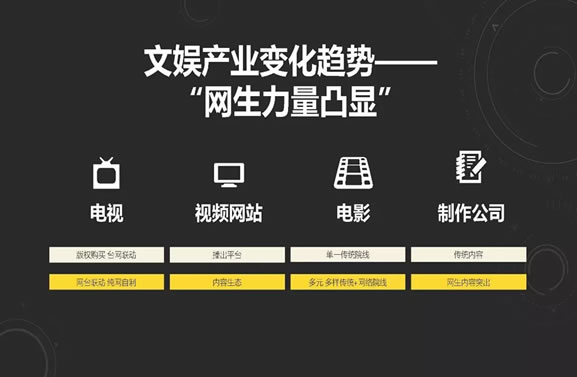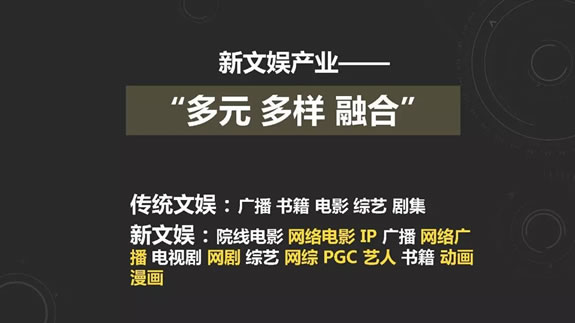 papi酱之前做了一场直播,两千万人看,这是又创造了一个个人直播的记录。很多年前,大家早上起来上班、上学听个广播,然后翻翻报纸、看看书,回家看看综艺和电视剧,放假的时候看看电影,也就这样了。现在我们时间碎片化,同时我们的消费渠道和观看渠道全都改变了,我们看到除了以前的之外,网络电影,网络广播、网剧网综,全都出来了。所以大家每天能看到更多层出不穷的内容,而每一个在新的文娱产业里面的垂直领域内容都有极深的释放空间。