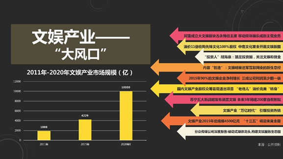 文娱产业,目前资本涌入的非常热。但是为什么这么热呢?其实它有两个原因,一个我们是从理性的纬度看,中国2015年人均的GDP产值达到了7800美元。到达7000美元,按照国际惯例,按照美国、日本、欧洲国家这些所有的先例来看,文娱产业就会迎来快速的增长,但是要达到每年1万美金的人均GDP产值,仍需好几年的时间,到1万美金的时候还会极速增长,其实目前还是中国文娱产业的早期。