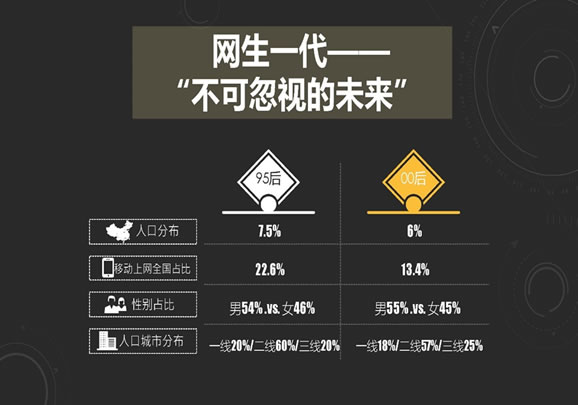 最后我再讲讲不可忽视未来的网生一代,从整个95后和00后的人口分布来看,它只占了目前全国人口13%而已,但它的移动上网全国的占比,基本上是占到了40%。