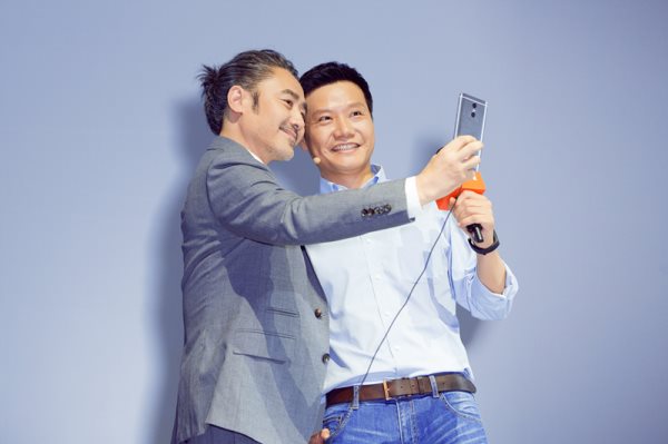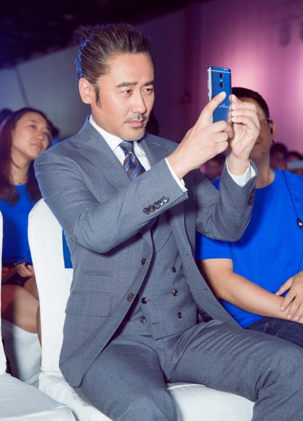 吴秀波一席浅灰色西装,休闲马甲搭配设计感斜棱文领带,优雅内涵、气质温暖。惯用小丸子头显得时尚气质十足。发布会现场,三位代言人手握新款手机,吴秀波还与雷军在台上玩儿起自拍,气氛十分有爱。