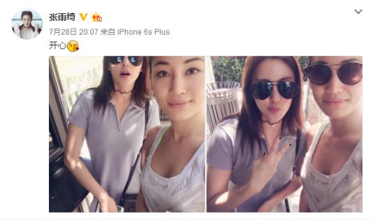 28日晚,张雨绮微博晒出和闺蜜游玩的照片,并直呼“开心”。