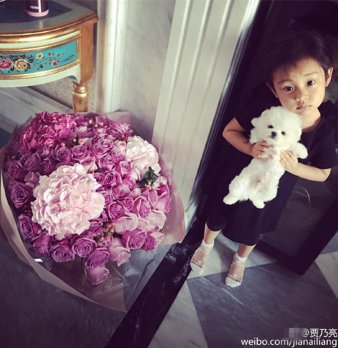 9日下午,贾乃亮在社交媒体上晒出了女儿甜馨的萌照,画面中甜馨站在一束玫瑰花旁边,手中抱着小狗,歪着头呆萌看镜头,相当可爱。