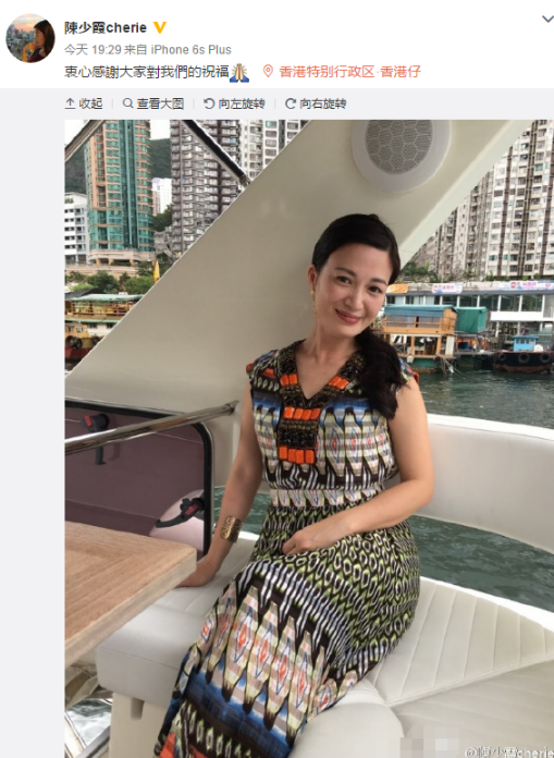 虽然陈少霞之前婚姻失败,还有两个女儿,不过如今她再找到真命天子,得到大家祝福的她,都难掩新婚喜悦,还在微博多谢大家祝福。照片中,她坐在游艇上,成了幸福少奶奶模样,真是好令人羡慕。