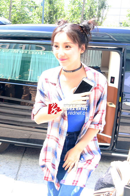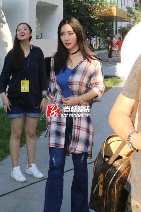 柳岩格子衬衫配牛仔裤好身材尽显。