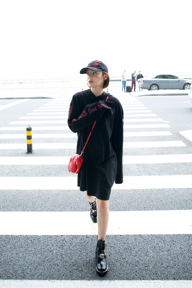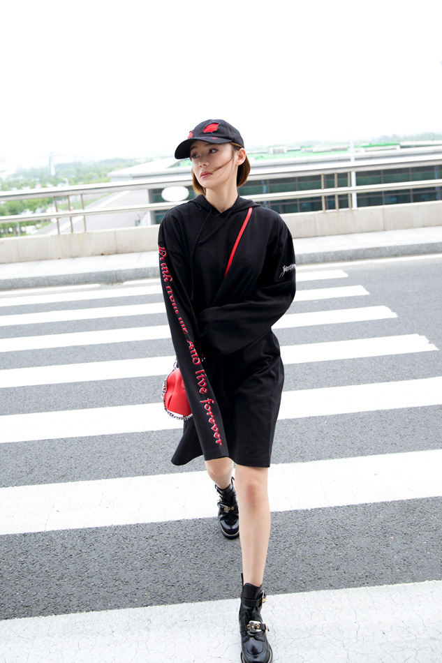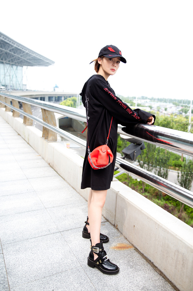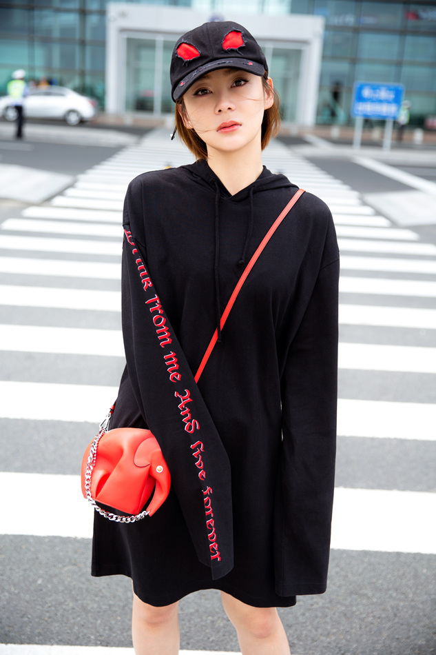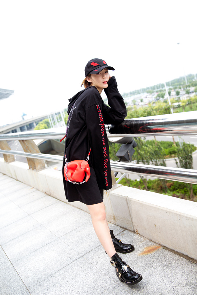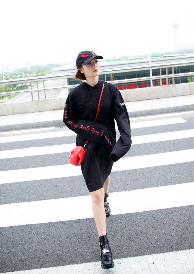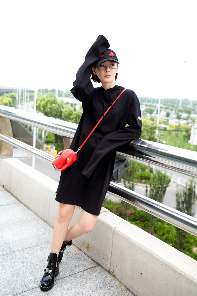 休闲BF风彰显个性青春!近日,袁姗姗曝光一组街拍大片,一身街头风装扮异常抢镜,红黑色系的交织碰撞出耀眼的摩登之感。黑色长款卫衣颇具休闲风范,上面一排红色英文字母的别致点缀,更增添一丝动感气息,袁姗姗头戴黑色帽子,斜跨红色精巧小包,显得个性十足。或扶栏而立,或漫步行走,其两条白皙美腿展露无遗,满满的运动气息扑面而来。