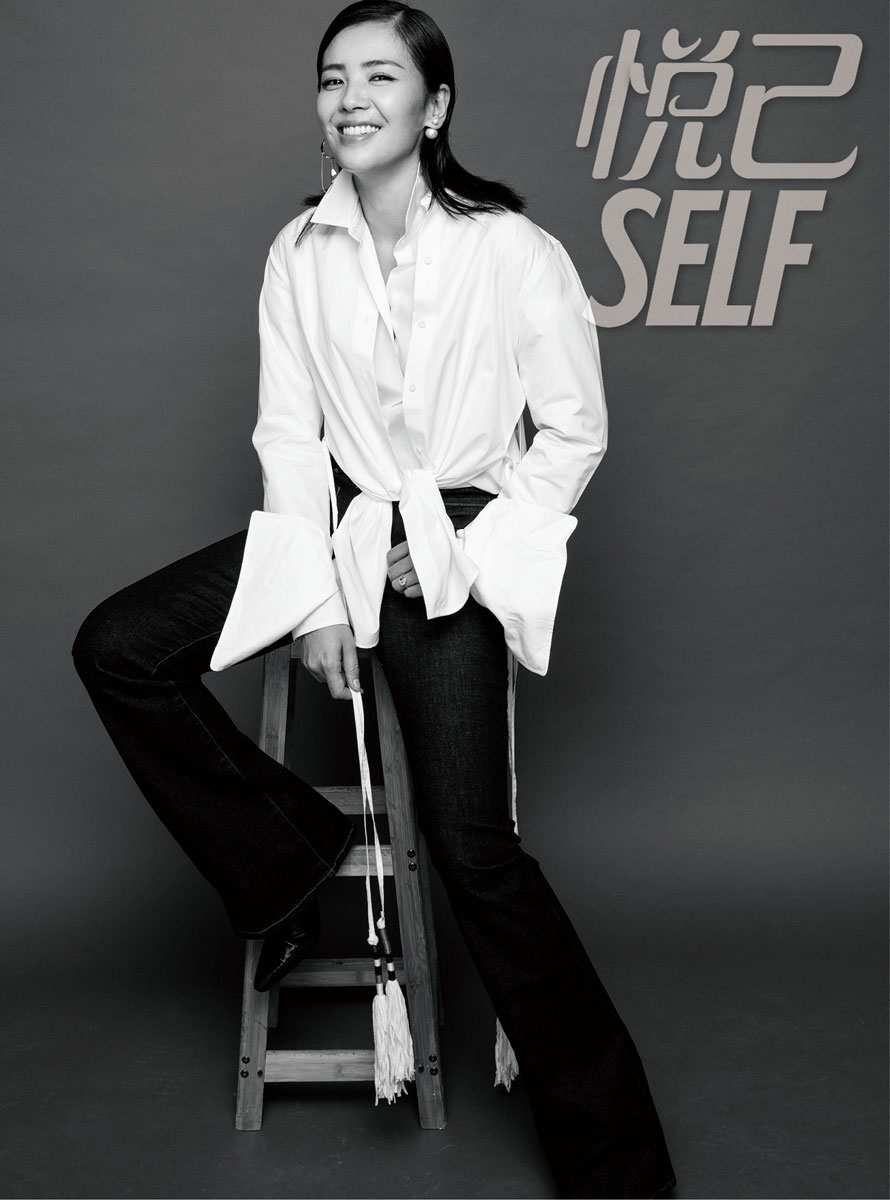 或以独特剪裁的白色衬衫搭配阔腿裤,露出灿烂微笑;或以白色修身西服点缀黑色丝带,冷峻袭人。在经典黑白暗色系背景中,刘涛的爽朗笑容,更加明媚动人。