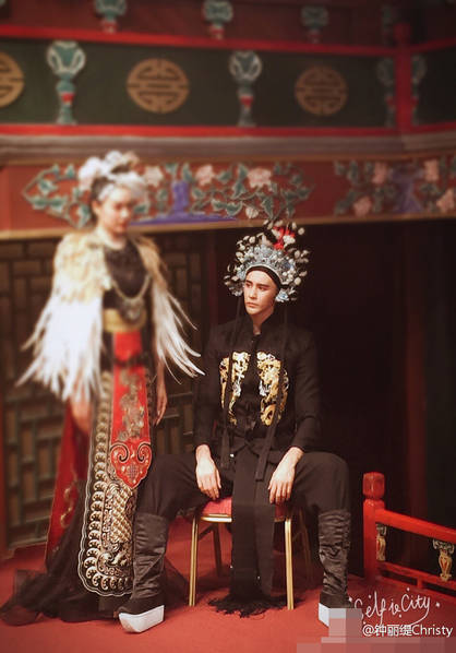 照片中,钟丽缇与张伦硕穿着京剧服装,摆出各种恩爱的动作,看起来十分有创意。