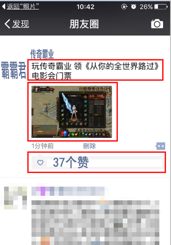 【Step2:微信截图】将上述截图发到朋友圈+文案“玩37《传奇霸业》领《从你的全世界路过》点映会门票”,集37个赞并截图;