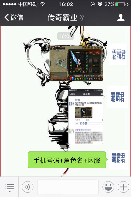 【Step3:截图回复】将以上两个步骤的两张截图发给37《传奇霸业》微信公众号,并回复自己的手机号码+角色名+游戏区服,即有机会成为幸运儿。