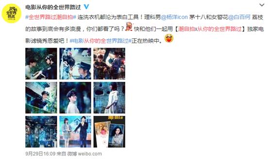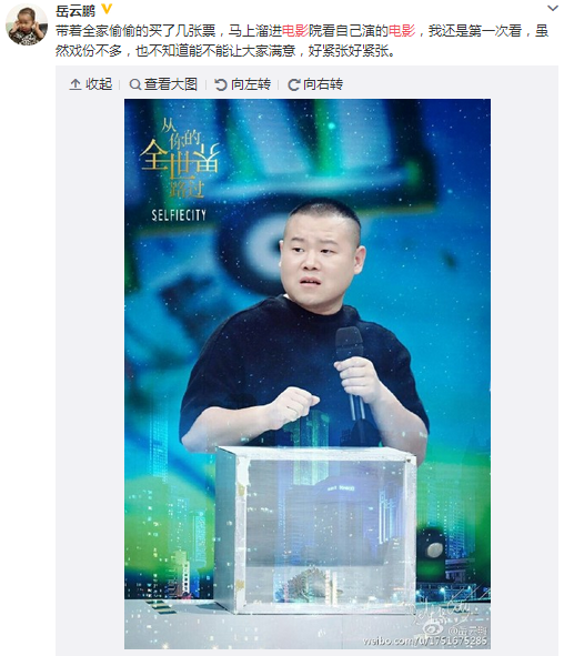 9月29日,《从你的全世界路过》全国火热上映,主演之一的岳云鹏于9月29日凌晨发微博表示买票带家人看电影,并称“第一次看”、“好紧张好紧张”,酷爱自拍的岳云鹏更配上自拍。仔细看,不难发现,岳云鹏使用了此次美图公司自拍产品“潮自拍”APP联合《从你的全世界路过》电影推出的海报同款独家“全世界路过”滤镜,蓝绿色调十分唯美,微博发出之后,更有网友在他的微博下评论“小岳岳加油!我爱你!男神么么哒”。