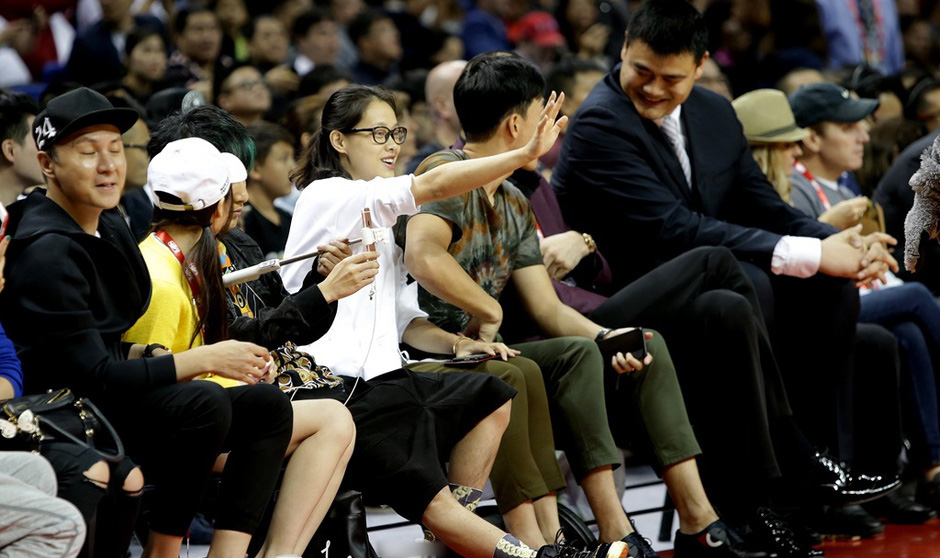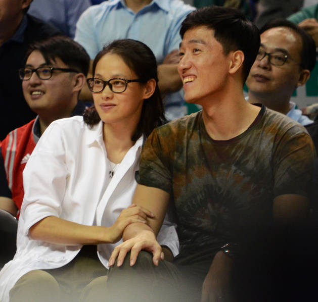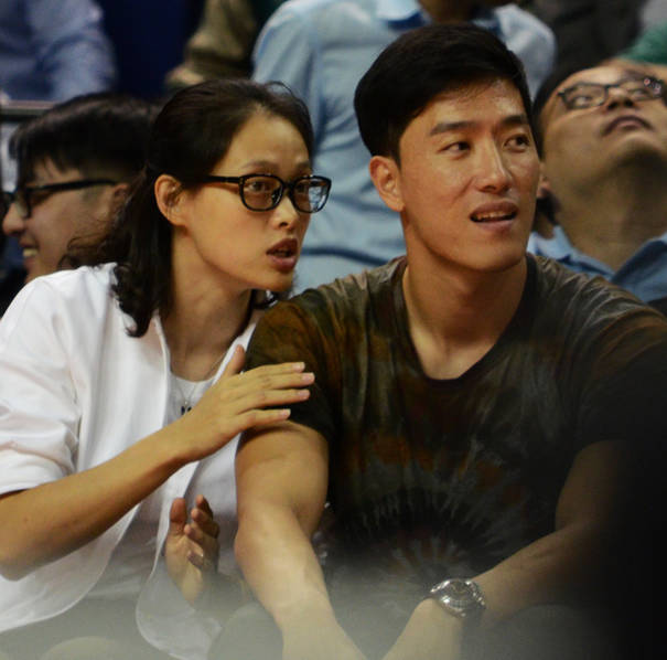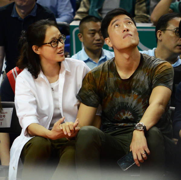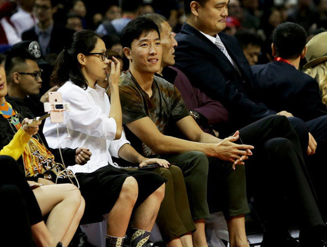 刘翔携妻子吴莎看球赛,台下忙与姚明热聊,吴莎裤子颜色与老公刘翔的太接近,才被大张伟“换腿”。