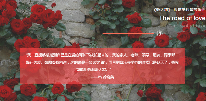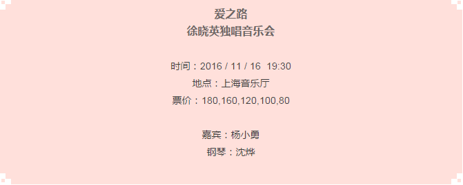 这次的音乐会有一个非常唯美的名字——《爱之路》,其中缘由除了本场曲目中有一曲普朗克的《爱之路》以外,徐晓英也想借它表达更多:“我毕业以后就一直留在上海歌剧院了,这一路,有掌声,有批评,但我一直能够感觉到自己是在爱的呵护下成长起来的,我的家人、老师、领导、朋友、同事都一路在关爱、鼓励着我前进,这的确是一条‘爱之路’;而且到音乐会举办的时候已是冬天了,我希望能用爱温暖大家。”