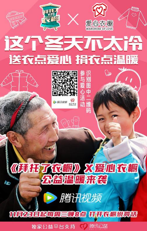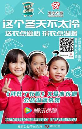 腾讯综艺即将上线的时尚脱口秀《拜托了衣橱》启动了这个寒冬最有意义的打开方式:“这个冬天不太冷”----暖心公益行动。《拜托了衣橱》携手中国青少年发展基金会旗下的公益组织“爱心衣橱”,得到腾讯公益的平台支持,发起了为偏远、贫困和高寒地区的孩子们捐衣、捐款的主题爱心活动。这一“网综+公益”的新模式,将通过送“衣”点爱心,捐“衣”点温暖,传递爱与关怀,引领阳光与环保的生活方式,让捐赠者与受捐人同时体验到“这个冬天不太冷”。