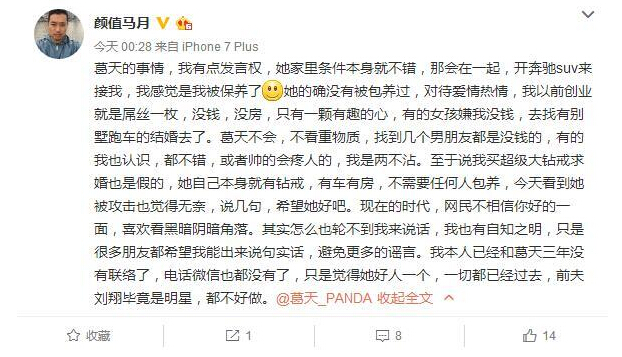葛天的事情,我有点发言权,她家里条件本身就不错,那会在一起,开奔驰suv来接我,我感觉是我被包养了,她的确没有被包养过,对待爱情热情,我以前创业就是屌丝一枚,没钱,没房,只有一颗有趣的心,有的女孩嫌我没钱,去找有别墅跑车的结婚去了。葛天不会,不看重物质,找到几个男朋友都是没钱的,有的我也认识,都不错,或者帅的会疼人的,我是两不沾。至于说我买超级大钻戒求婚也是假的,她自己本身就有钻戒,有车有房,不需要任何人包养,今天看到她被攻击也觉得无奈,说几句,希望她好吧。现在的时代,网民不相信你好的一面,喜欢看黑暗阴暗角落。其实怎么也轮不到我来说话,我也有自知之明,只是很多朋友都希望我能出来说句实话,避免更多的谣言。我本人已经和葛天三年没有联络了,电话微信也都没有了,只是觉得她好人一个,一切都已经过去,前夫刘翔毕竟是明星,都不好做。