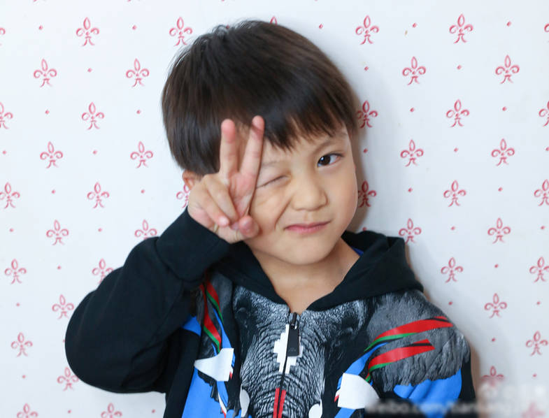 小亮仔面对镜头比耶卖萌。