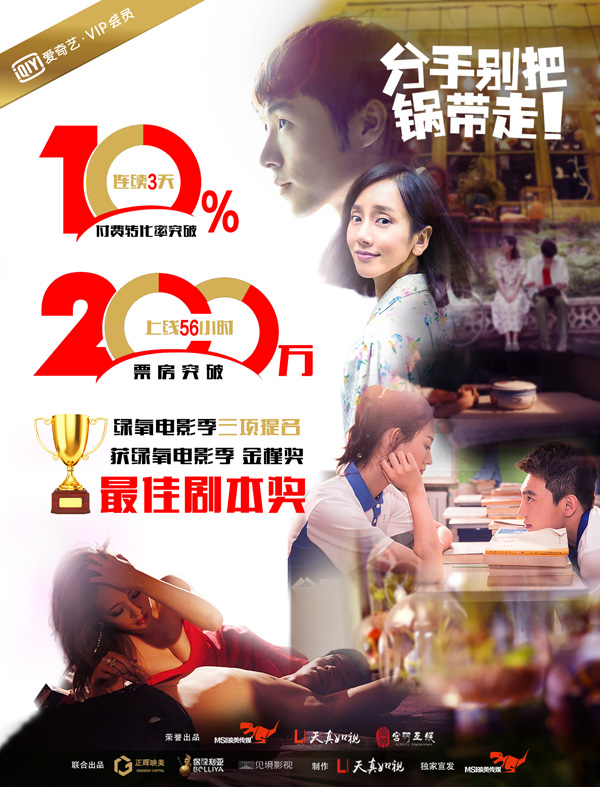 昨日,广西南宁绿氧电影季金槿奖颁奖典礼落下帷幕,网络大电影《分手别把锅带走》获得最佳剧本、最佳导演、最佳女配角三项提名,并最终斩获最佳剧本奖。这部11.11日在爱奇艺独家上线的影片,可谓票房和奖项双丰收,上线56小时,票房突破200万,付费转化率连续三天突破10%,堪称今年冬天的网大暖流。