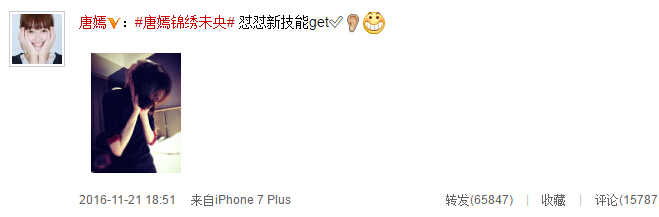 11月21日唐嫣更新微博,她晒出一张瑜伽动作的照片并配文写道“怼怼新技能get”。照片中唐嫣身穿一件黑色的上衣,她将双手放在身后并捧起了向后扬起的头,动作柔韧性极高。但是不少网友表示,一打眼还误以为唐嫣把头扭了180度,纷纷感到惊悚。