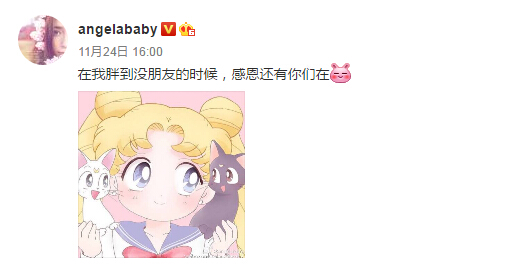 11月24日晚上,baby在微博中发文调侃自己怀孕后的身材,她称自己胖到没朋友,并且感谢“在胖到没朋友的时候,还有你们在。”据悉,Baby已怀有5个月的身孕。