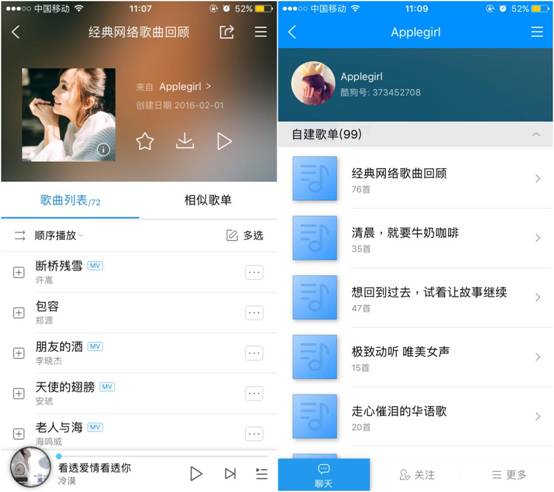 浏览歌单时,不仅可以欣赏优质的网络歌曲,创建该歌单的用户名称也会在页面显示。点击此用户,即可看到该名网友创建的所有歌单,还可在此与喜欢相同音乐类型的“知音”聊天互粉,一定程度上增加了音乐爱好者之间的互动性。