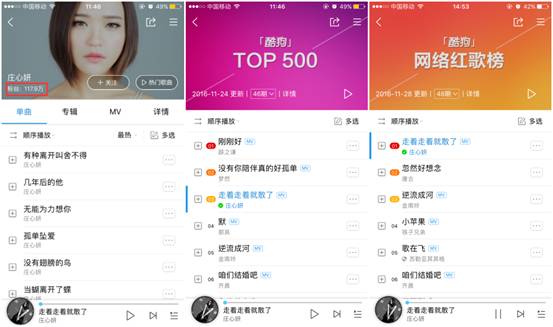以最近在网络上较受欢迎的歌手庄心妍为例,本是从酷狗直播(原繁星直播)平台走出的她,如今积累了不少自己的粉丝,仅在酷狗音乐APP上就有117.9万歌迷关注。由她演唱的经典网络情歌《走着走着就散了》也有着较高的传唱度,并长期占领“酷狗TOP500”榜单前几名的位置,在最新一期“网络红歌榜”中,这首歌更是霸占榜首,获得不俗的成绩。