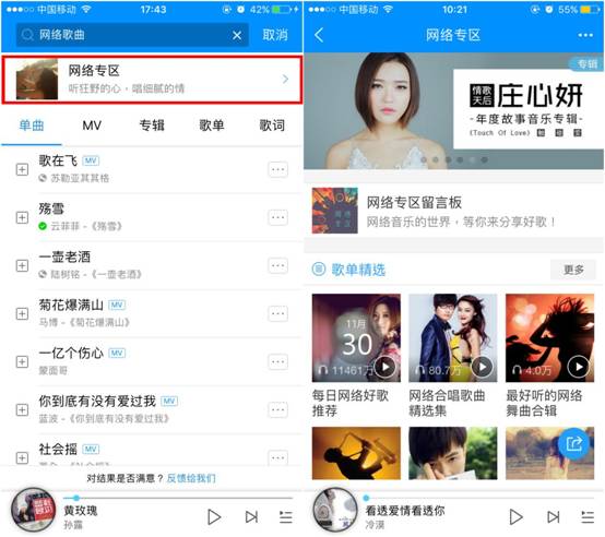 为了贴合大众不同的音乐口味,酷狗音乐为喜爱网络歌曲的乐迷们创立了“网络专区”,在酷狗音乐APP搜索栏中输入“网络歌曲”,即可点击进入该专区。其中包括“歌单精选”、“网络音乐电台”、“今日·心情”、“特色分类”、“新歌推介”,以及热门歌手、MV等专题内容,十分方便网友按照自己听歌的需求进行选择。