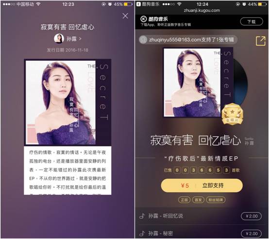 而从酷狗直播(原繁星直播)走出的歌手,有不少人都发表了自己的个人专辑,销售量甚至超过了许多当红艺人,粉丝们很愿意为自己喜欢的网络歌手买单。