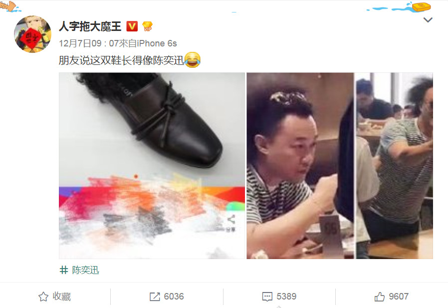微博上有名网友贴出1张购物网站的截图,是一双黑色的鞋子、后跟部分还有一撮毛作装饰,看似只是设计比较特别的皮鞋罢了,没想到他下了这样的注解,“朋友说这双鞋长得像陈奕迅”,配上笑到流泪的表情符号外,再附上一张陈奕迅的照片。