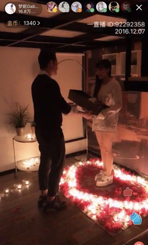 昨晚,长相酷似Angelababy的北舞校花梦妮Gabby一反直播界的常规,作为当红女主播直接在直播中曝光自己的素人男友,原来相恋8年的男友当晚拿着一枚特别定制的房子造型的BLOVES婚戒,惊喜求婚,梦妮感动于男友多年来的默默付出,决定用这种方式公布恋情,但这样的行为直接激怒了从其毕业就一直力捧她的经纪公司,其经纪人在直播过程中不断以连环电话和威胁式弹幕试图阻止直播,而梦妮任性秀爱,称爱情不能只看钱。