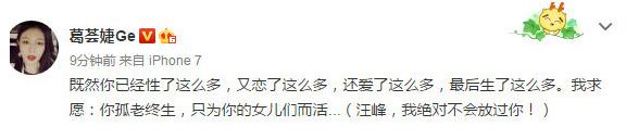 12月13日,葛荟婕晒出一张近照,并配文,直接喊话汪峰“我绝对不会放过你”。
